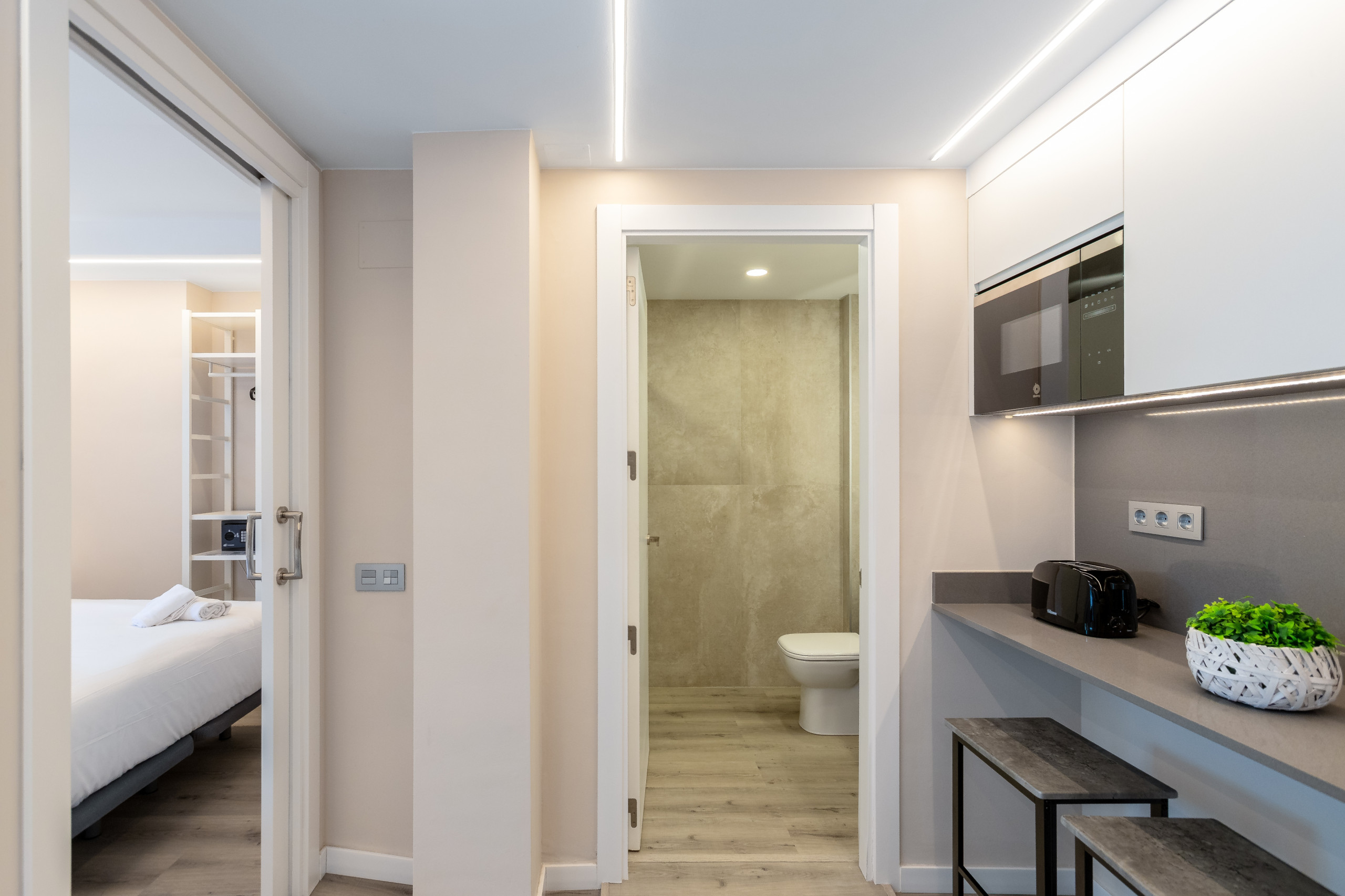 Descubra Xaloc, un apartamento diseñado para ofrecerle la máxima comodidad y funcionalidad. Al entrar, lo recibe una cocina moderna y un gran armario para su comodidad. El baño completo garantiza su comodidad. La habitación principal tiene una cama doble y acceso a una terraza rectangular desde donde podrá disfrutar de momentos de paz. También es posible incluir un sofá cama, lo que convierte a Xaloc en una opción ideal para parejas o familias pequeñas.